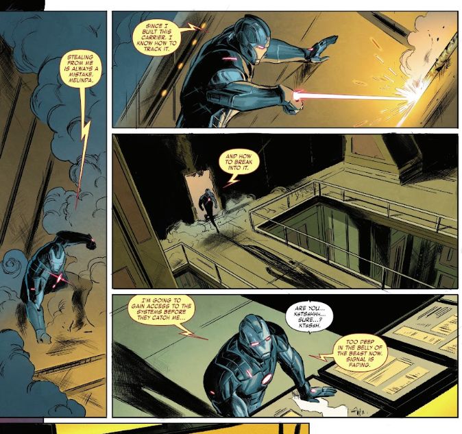 James Rhodes wore this new armor as seen in Iron Man The Invincible Iron Man #518. Like several of the armors, it had a stealth component.